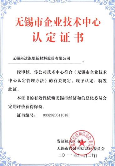 無(wú)錫興達(dá)泡塑新材料股份有限公司榮獲無(wú)錫市企業(yè)認(rèn)定證書